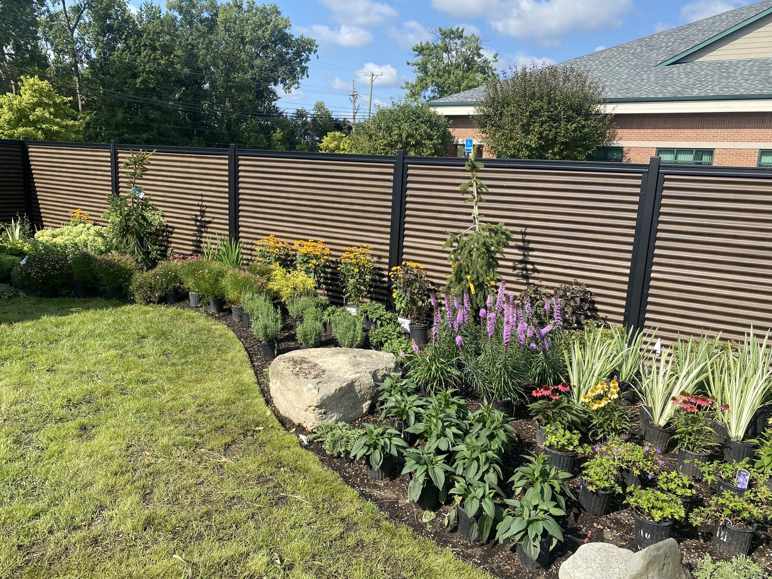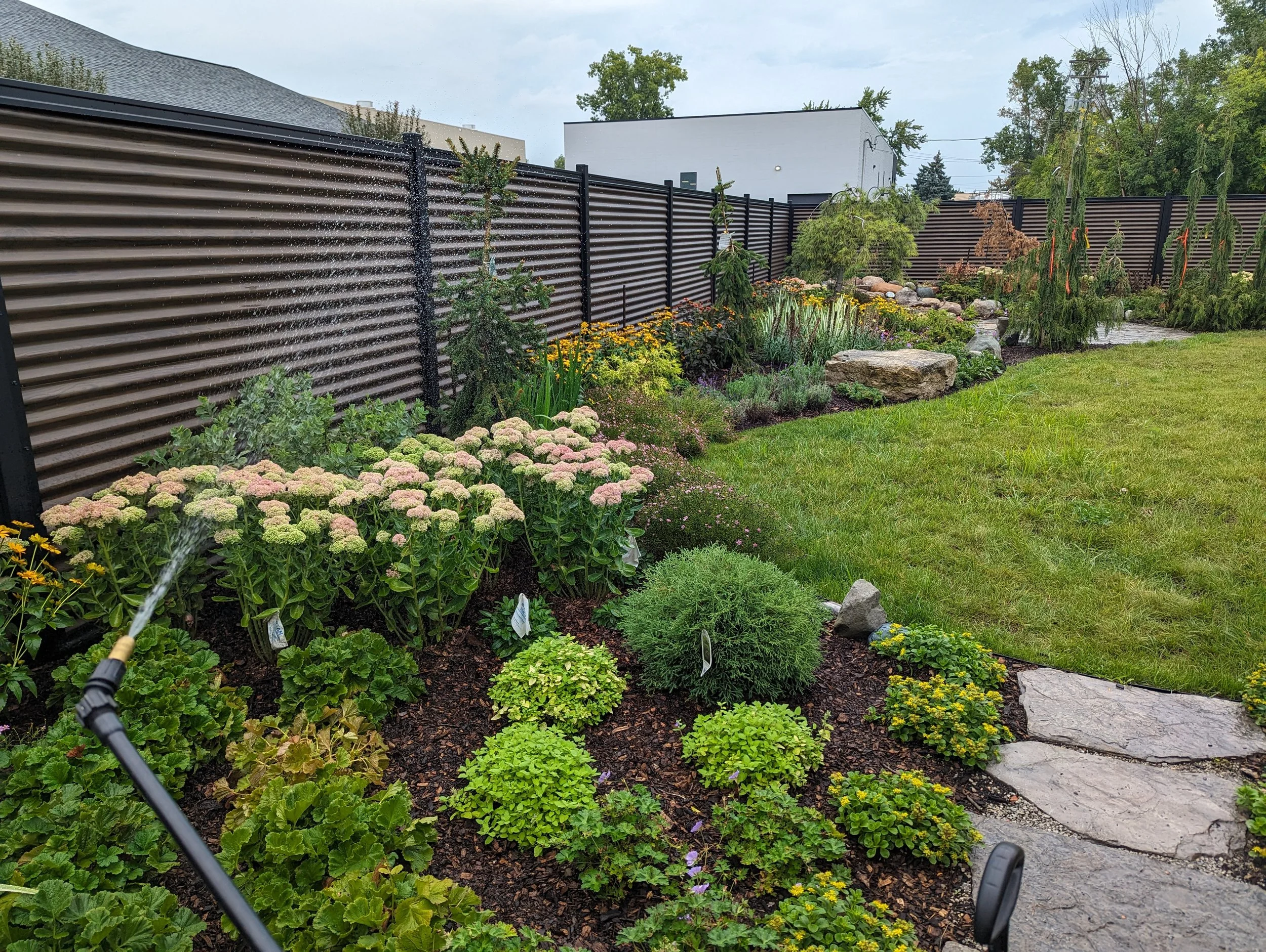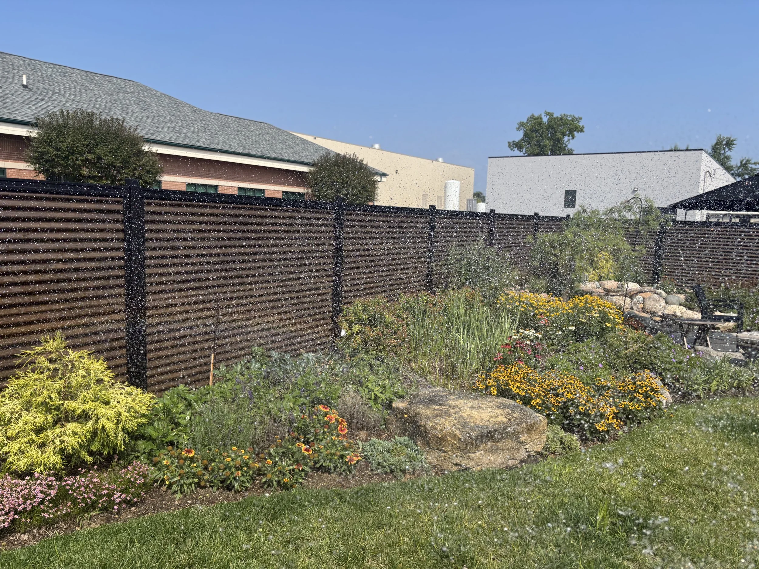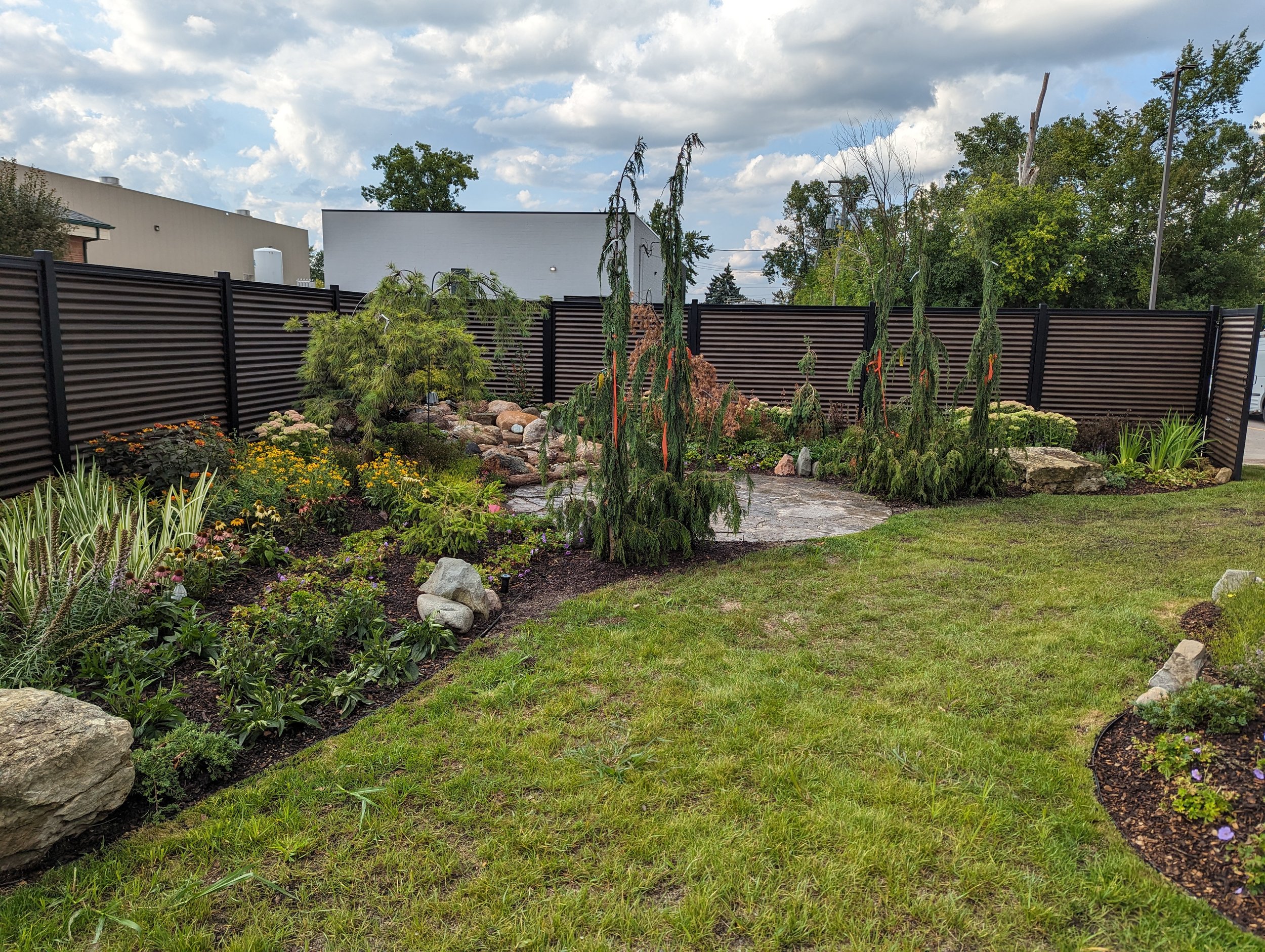 The outdoor patient gathering space was planted with indigenous, colorful, and fragrant perennials, interwoven with Dr. Hetes’ love of conifers, and even features a Biodynamic Banana Tree from ROI Urban Farms as a unique focal point. The soil system was constructed following strict biodynamic principles, excavated to native clay and layered with river sand, then finished with our Biodynamic Compost, Biodynamic Preparations, and annual biodynamic manuring to support a thriving soil biology. The flagstone patios are 100% permeable, engineered to manage stormwater events up to a 12-inch, 1,000-year rainfall, allowing water to naturally infiltrate and recharge the soil. A northwest corner waterfall returns the movement of water back toward the garden and patio, where benches provide a peaceful place for patients and their families to sit, reflect, and share quiet moments together in nature.