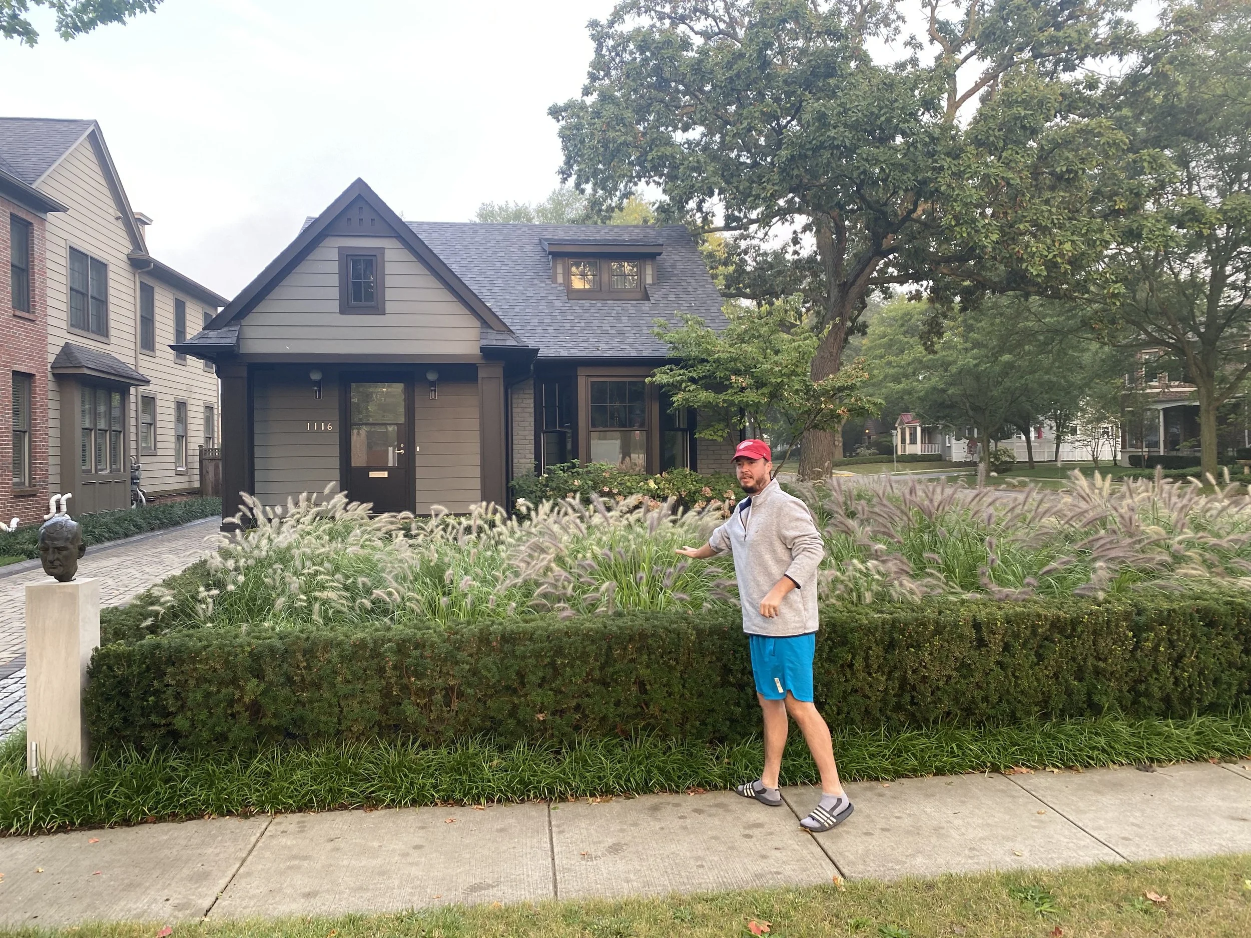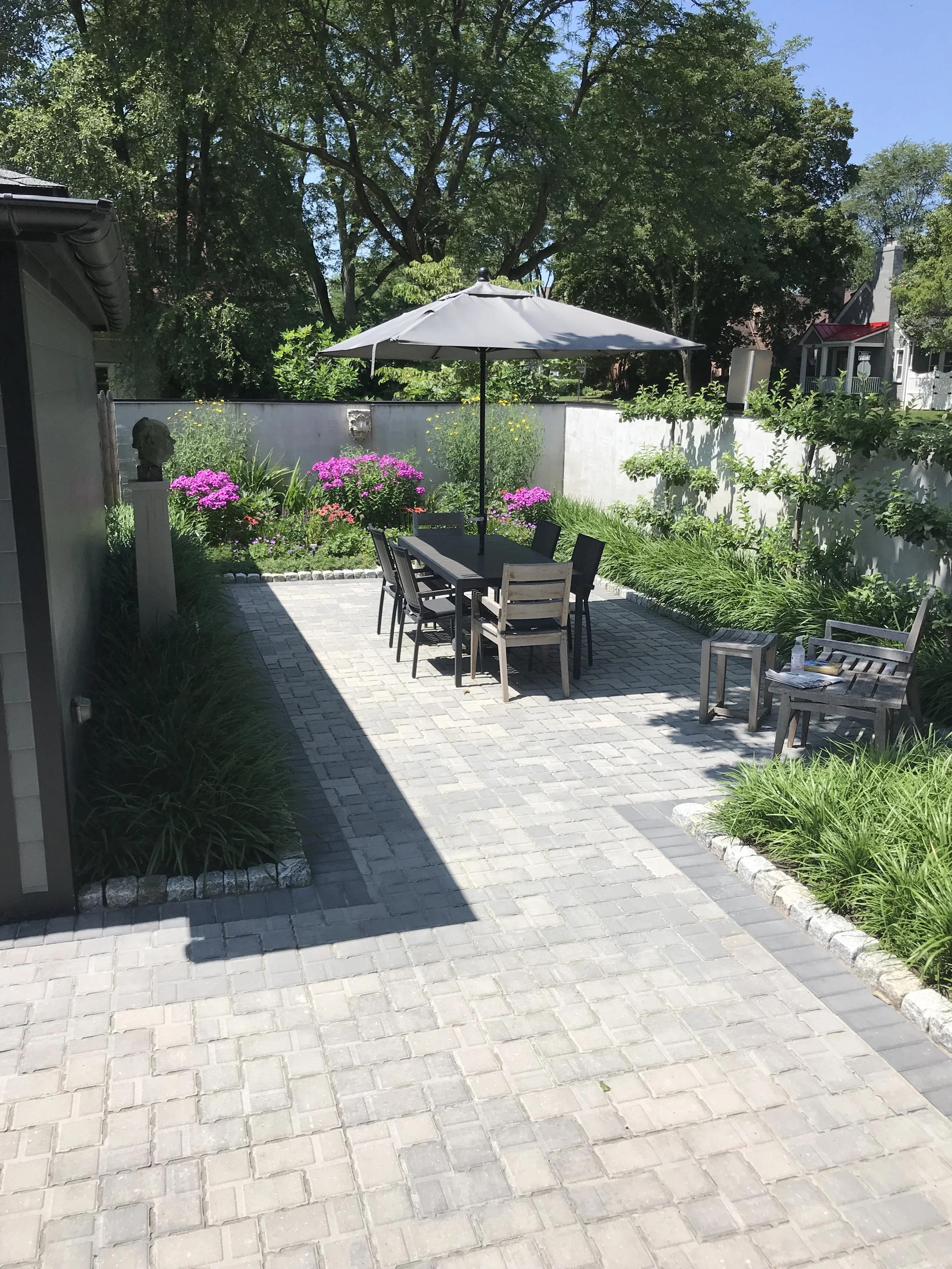 The goal of this project was to integrate traditional formal garden design with a full understanding and application of Permaculture principles (as developed at the University of Tasmania in 1978), while remaining compliant with the City of Birmingham’s land-use and surface coverage requirements. Particular attention was given to accurately distinguishing between impervious and permeable surfaces and how each is calculated within municipal land-use and development formulas. The design incorporates native grass plantings, a permeable driveway and patio, and our drainage diffusement chamber technology, which captures and manages all surface stormwater runoff generated from the rear of the house and the adjacent garage. The permeable brick pavers are installed over our proprietary, engineered base materials designed specifically for surface stormwater volumetric management. This system allows water to infiltrate and disperse naturally within the landscape. No irrigation system was designed or installed. The landscape is intended to function without supplemental watering—eliminating the need to use potable drinking water to maintain a lawn.